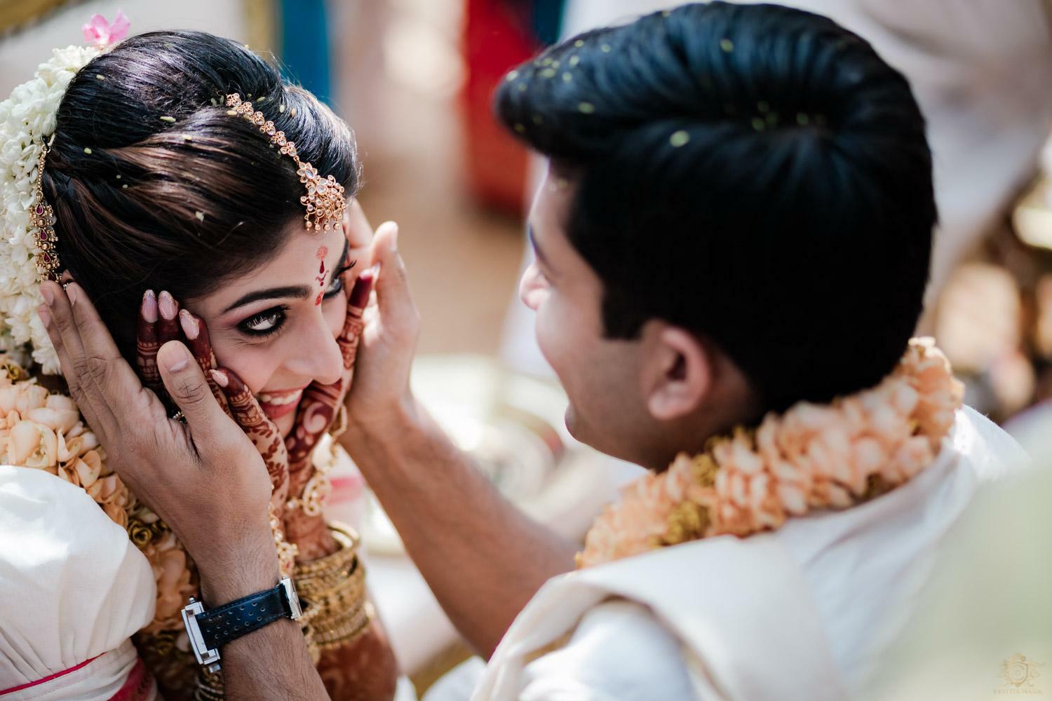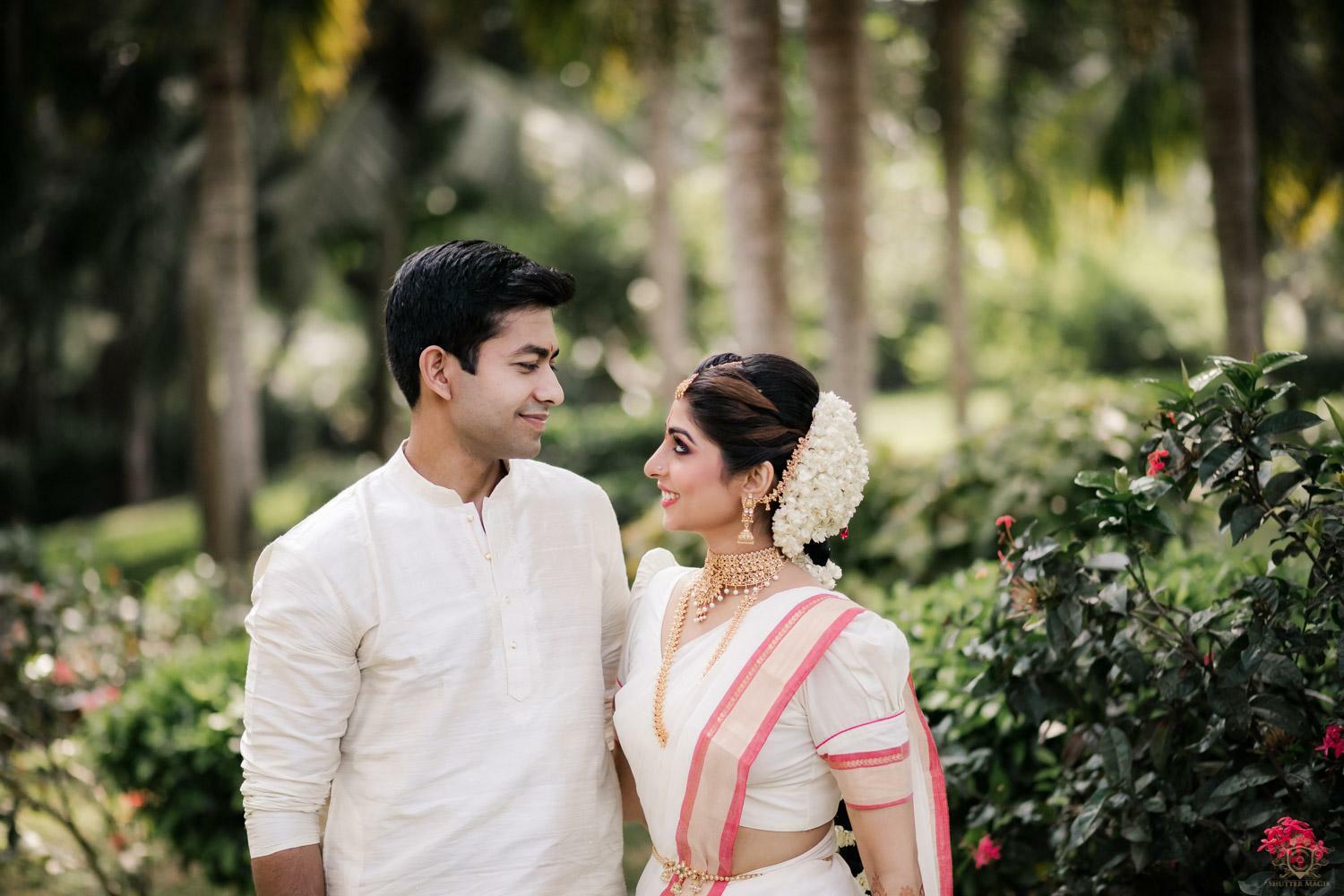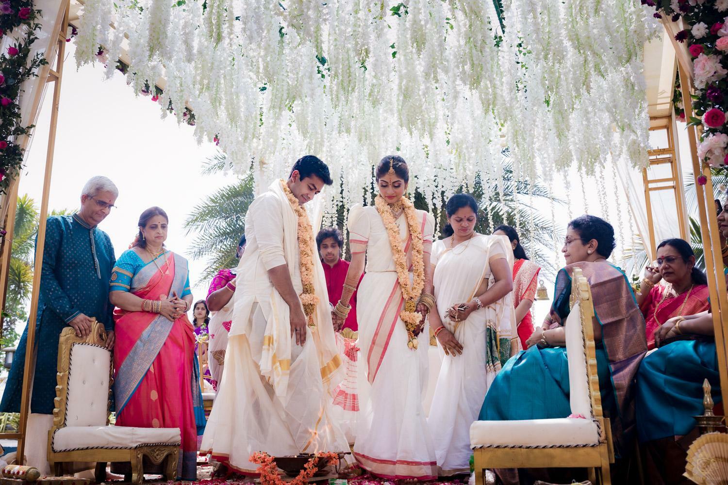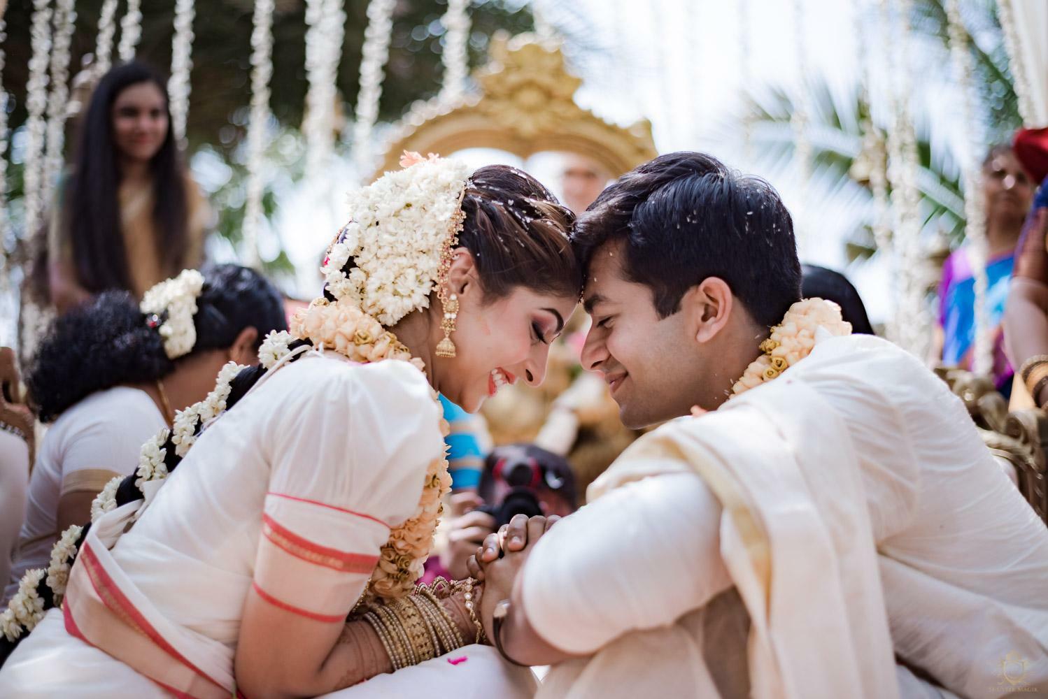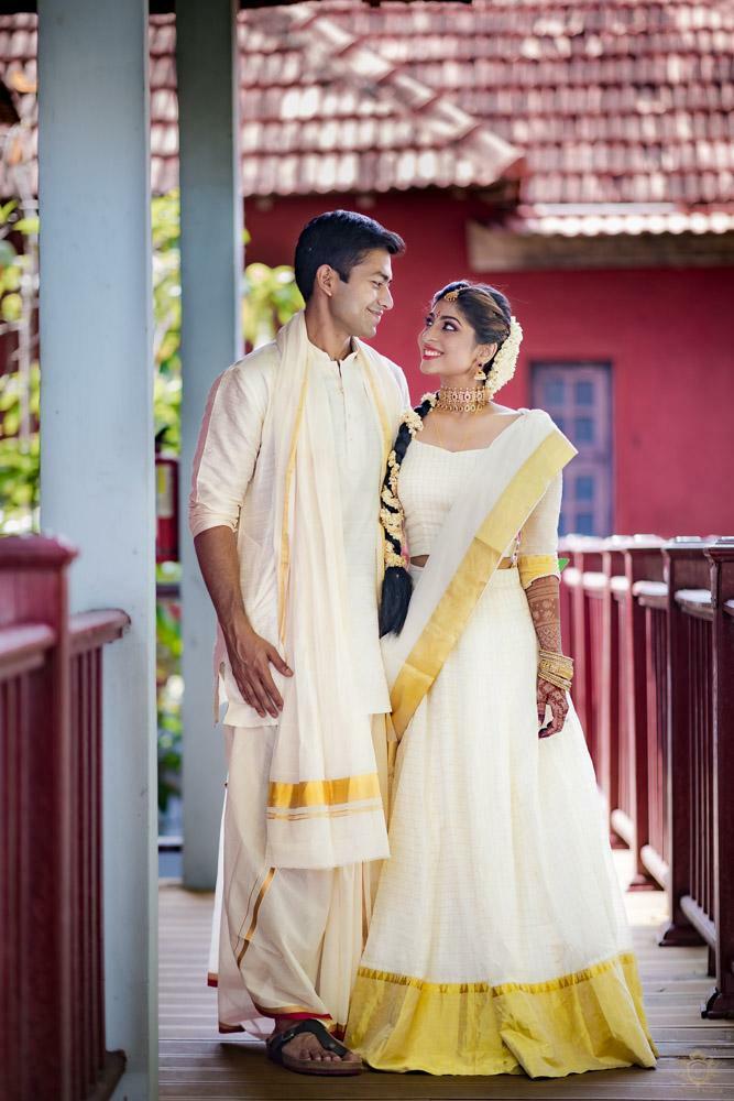 A wedding behind the backwaters surrounded by the grandeur of palm trees at the Poovar Island Resort. A two-day Tamil-Malayali traditional mix full of classic fun was all that Adarsh Matangi’s wedding was about. The wedding of Adarsh and Matangi was a visual retreat for our photographers. A couple so busy and lost in themselves is just always a treat for us wedding photographers. We couldn’t ask for anything more other than their genuinely happy faces and those spontaneous intimate moments. And we so genuinely enjoyed the candid ace level fun we could capture beside the trail of the coconut trees.