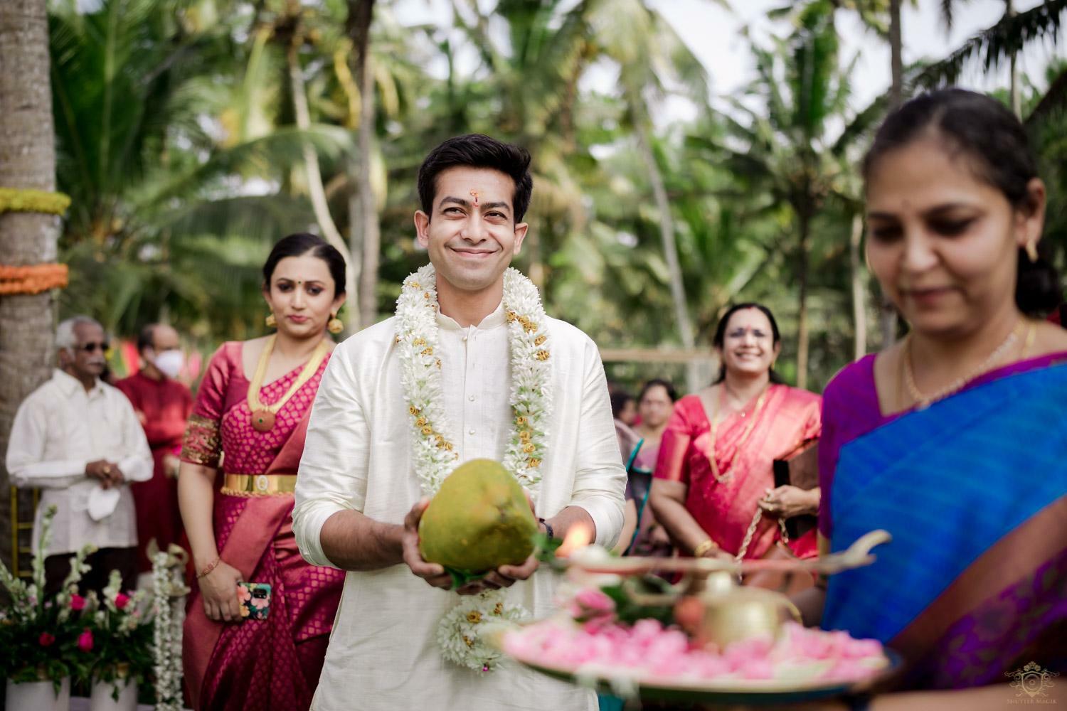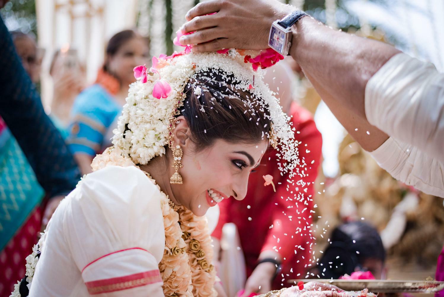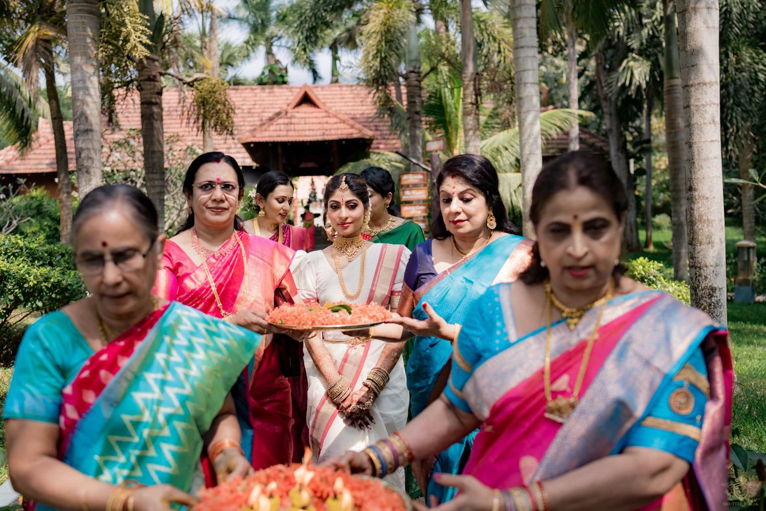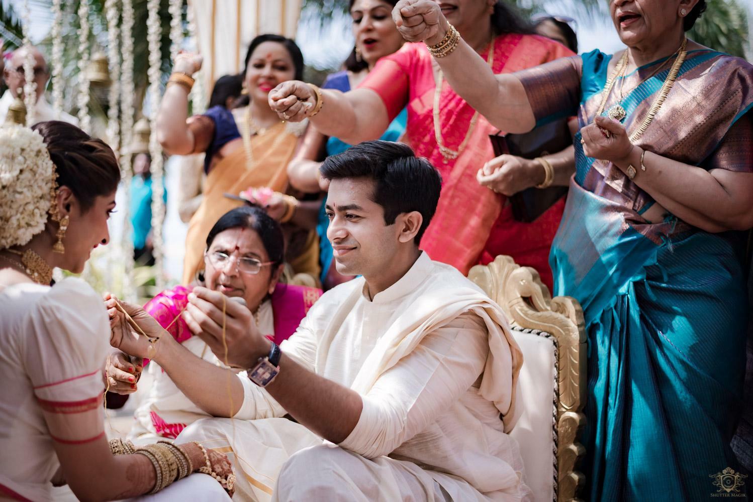 A wedding behind the backwaters surrounded by the grandeur of palm trees at the Poovar Island Resort. A two-day Tamil-Malayali traditional mix full of classic fun was all that Adarsh Matangi’s wedding was about. The wedding of Adarsh and Matangi was a visual retreat for our photographers. A couple so busy and lost in themselves is just always a treat for us wedding photographers. We couldn’t ask for anything more other than their genuinely happy faces and those spontaneous intimate moments. And we so genuinely enjoyed the candid ace level fun we could capture beside the trail of the coconut trees.