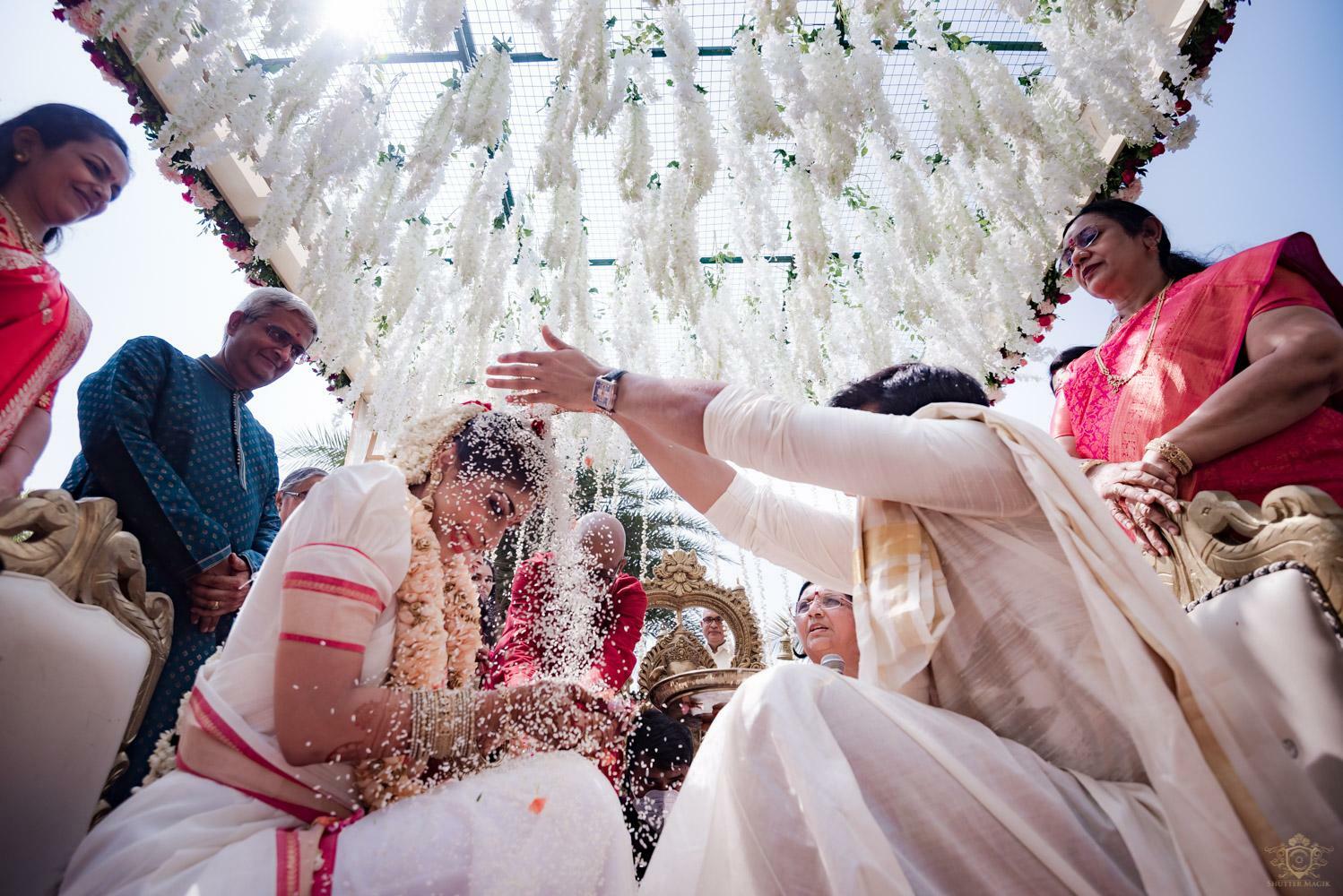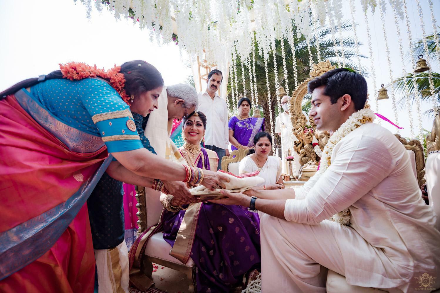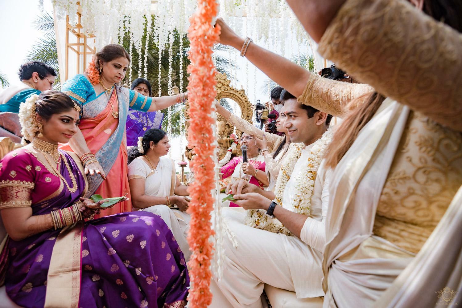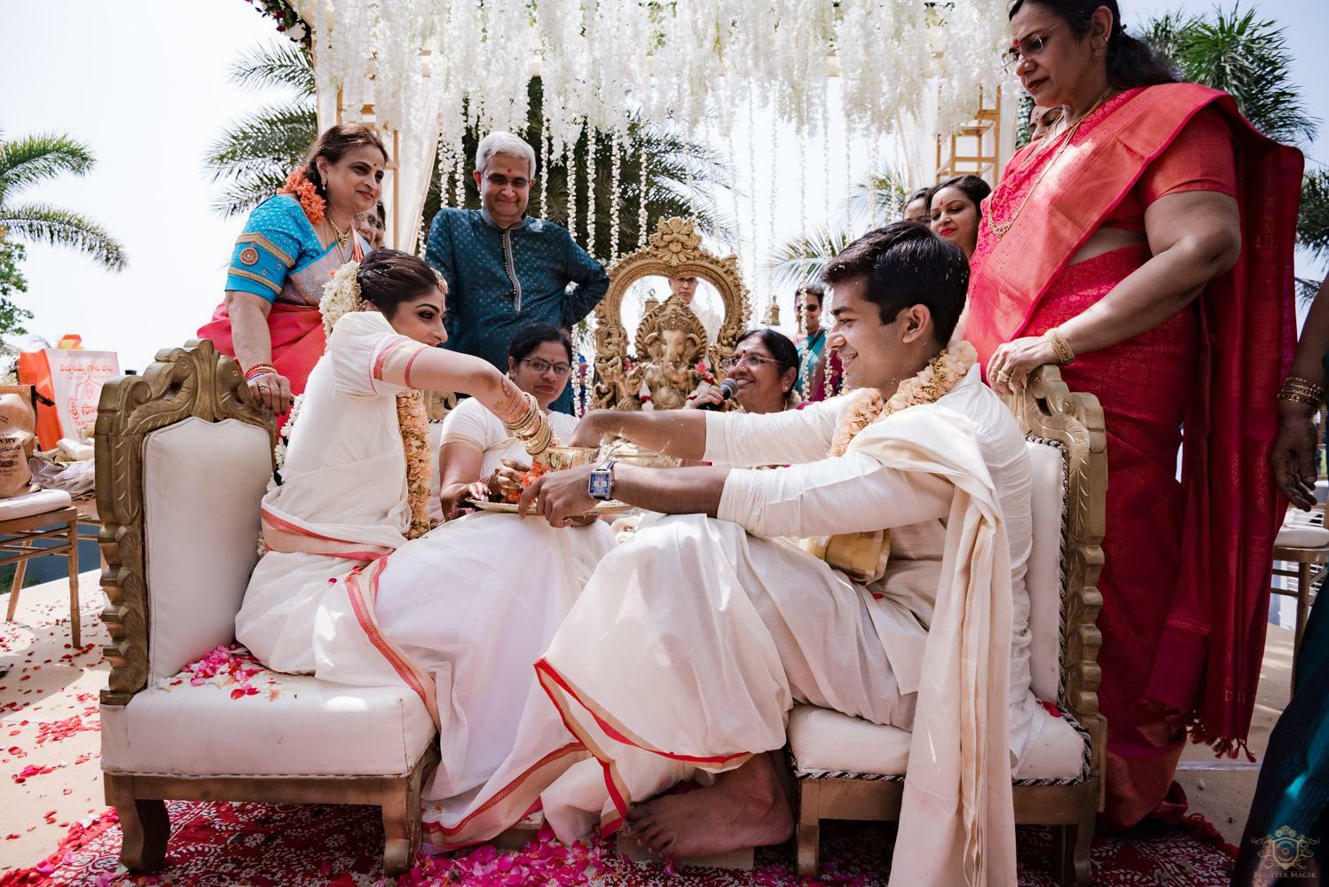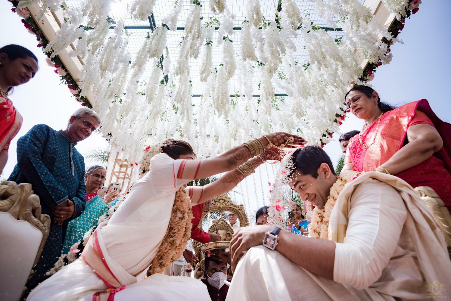 A wedding behind the backwaters surrounded by the grandeur of palm trees at the Poovar Island Resort. A two-day Tamil-Malayali traditional mix full of classic fun was all that Adarsh Matangi’s wedding was about. The wedding of Adarsh and Matangi was a visual retreat for our photographers. A couple so busy and lost in themselves is just always a treat for us wedding photographers. We couldn’t ask for anything more other than their genuinely happy faces and those spontaneous intimate moments. And we so genuinely enjoyed the candid ace level fun we could capture beside the trail of the coconut trees.