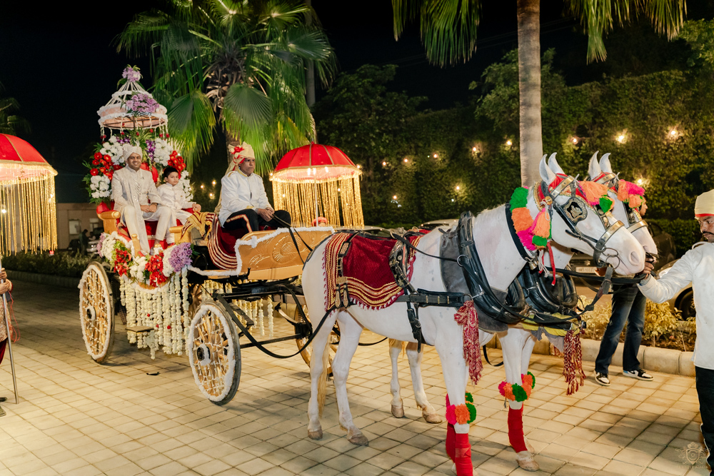 The final day brought with it the most awaited ceremony—the wedding. The mandap, adorned with white and red roses, was a grand yet elegant setting for Vaishnavi and Rohan’s traditional Maharashtrian wedding. Rohan, dressed in a chic off-white sherwani, led a lively baraat filled with energy and excitement, setting the stage for the momentous occasion.